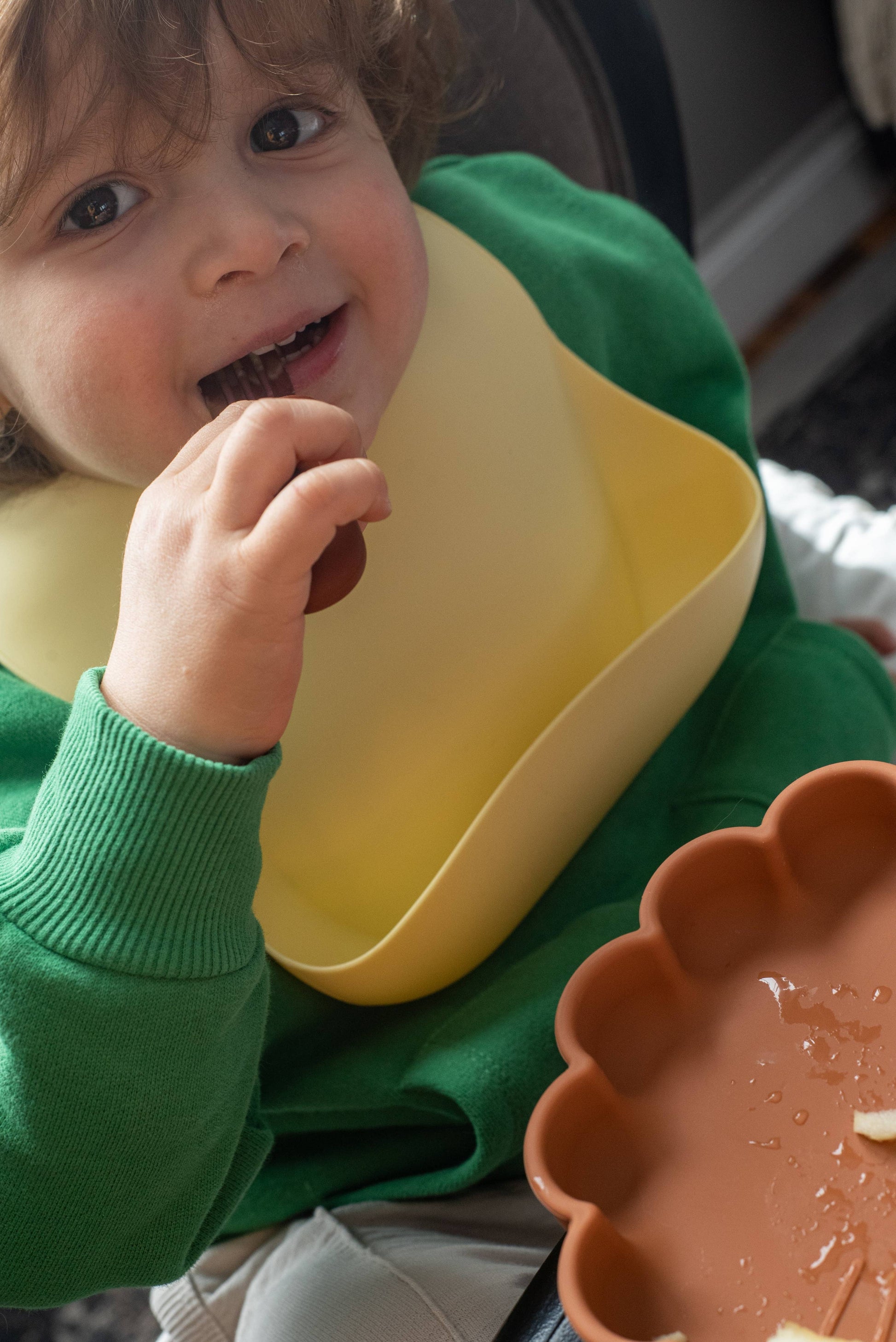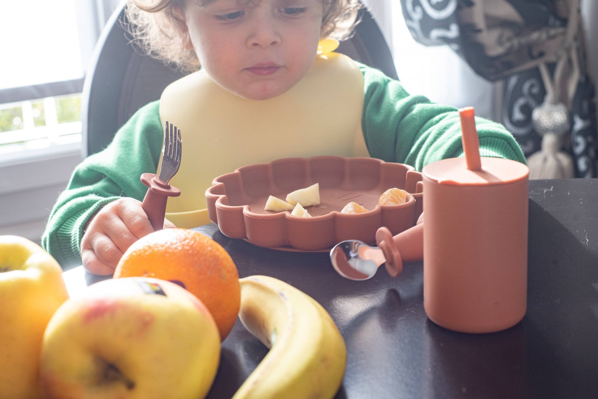 A silicone material for a good grip that does not slip. It is a protective barrier to prevent children from putting their cutlery too much in their mouths!
