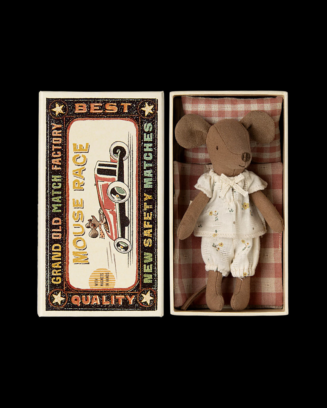 A classic Maileg item. This mouse is ready for hours of play and sleeps tight in the little matchbox. The clothes and bedlinen are made of soft fabrics with unique prints in beautiful colors. Extend the story by adding accessories to the play