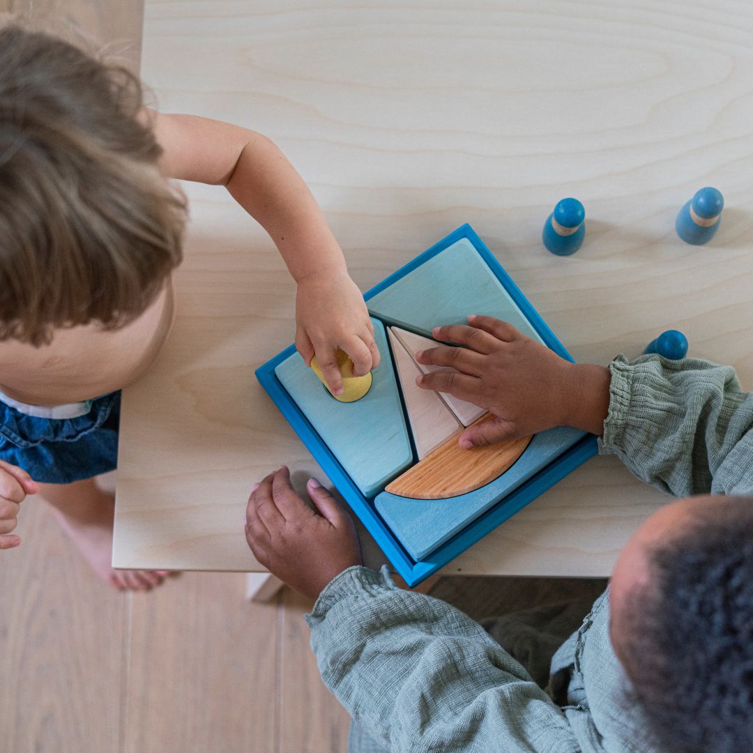 Carried by gentle waves, the sailing boat glides across the calming blue sea. Outside the frame, the geometric building blocks become imaginative animal shapes.