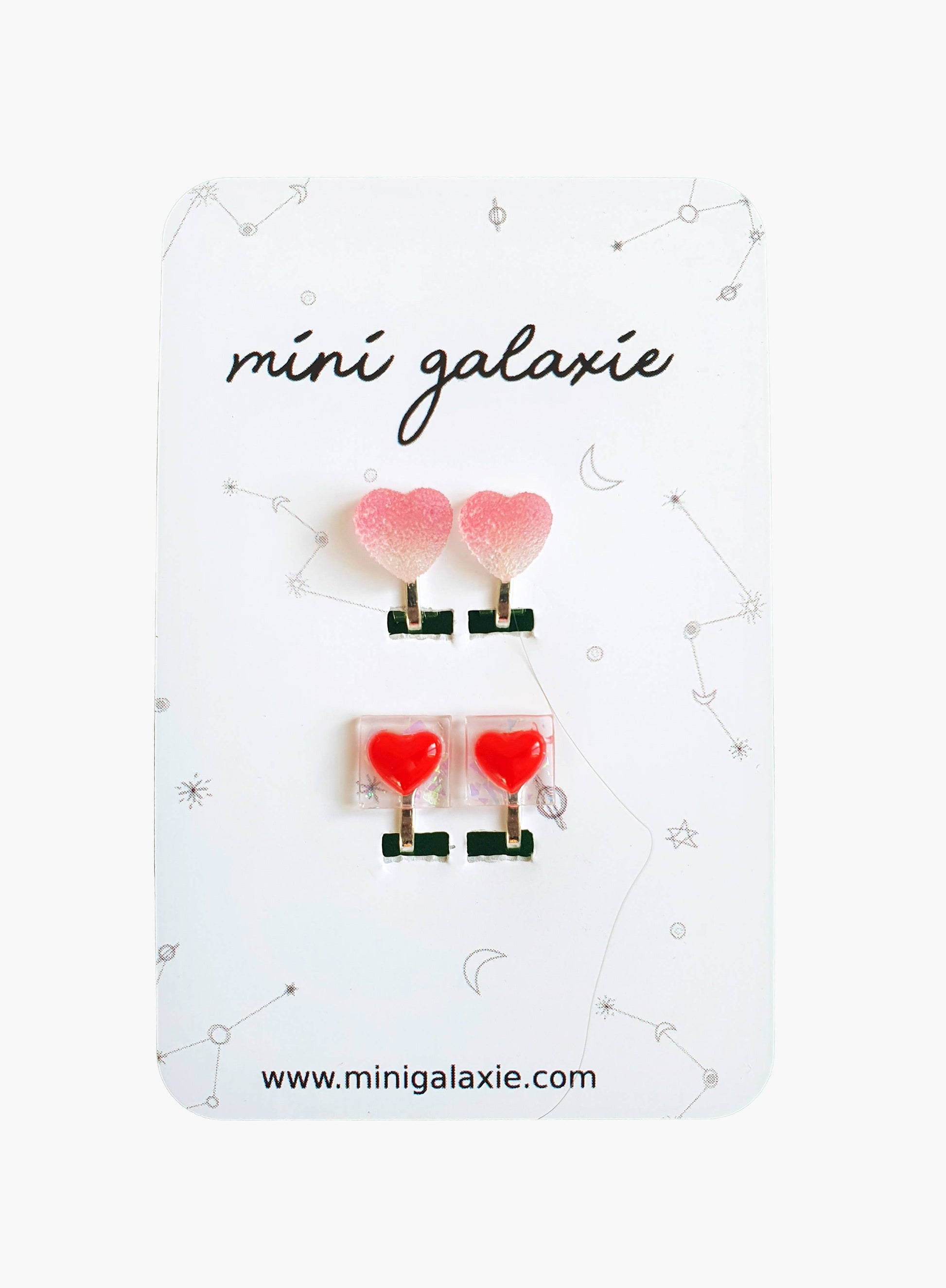 This set of two pairs includes earrings with candy pink hearts and red hearts on glitter.