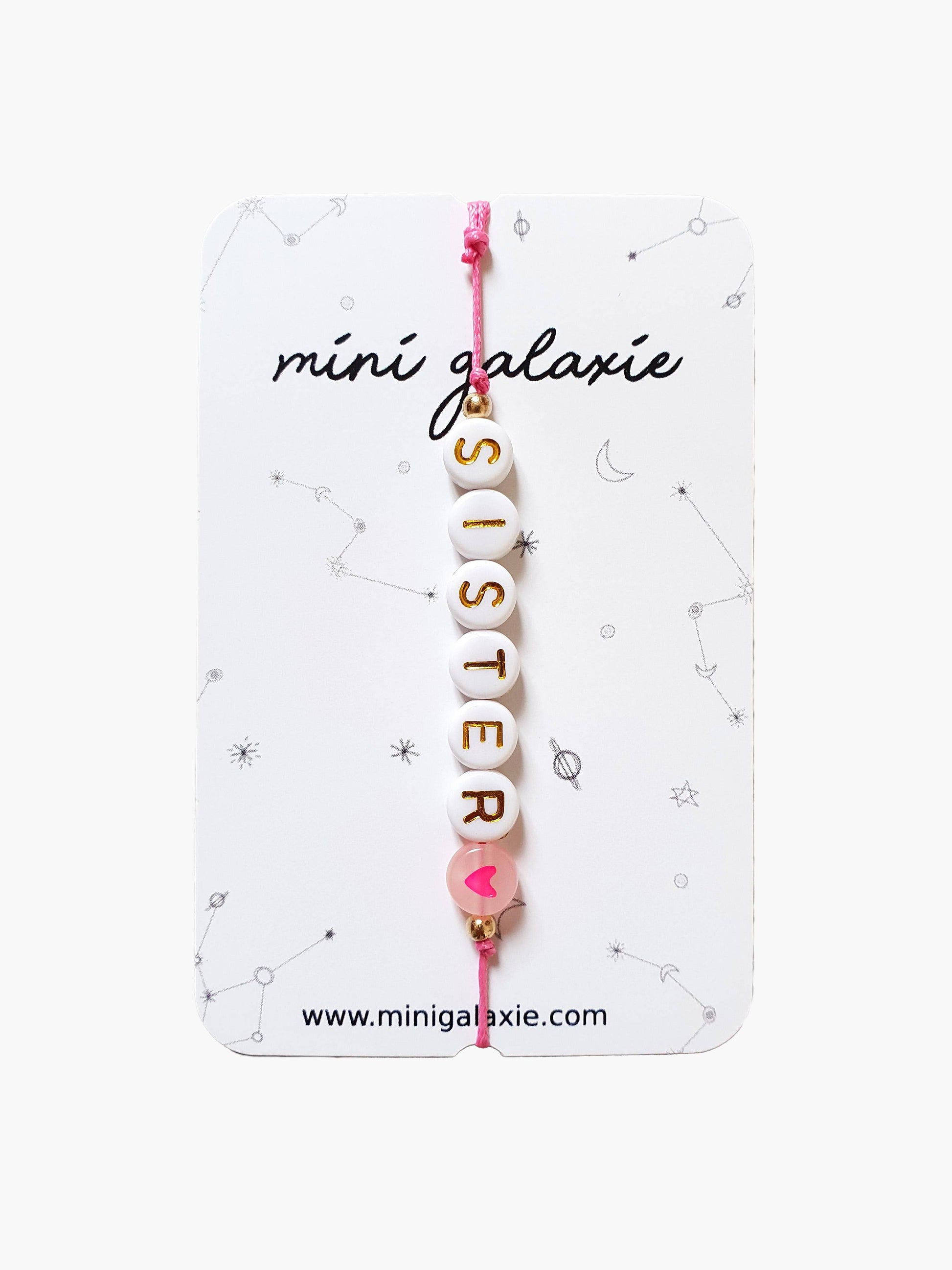 This bracelet is made up of white pearls with gold letters and a fluorescent heart bead; and a fuchsia pink cord.