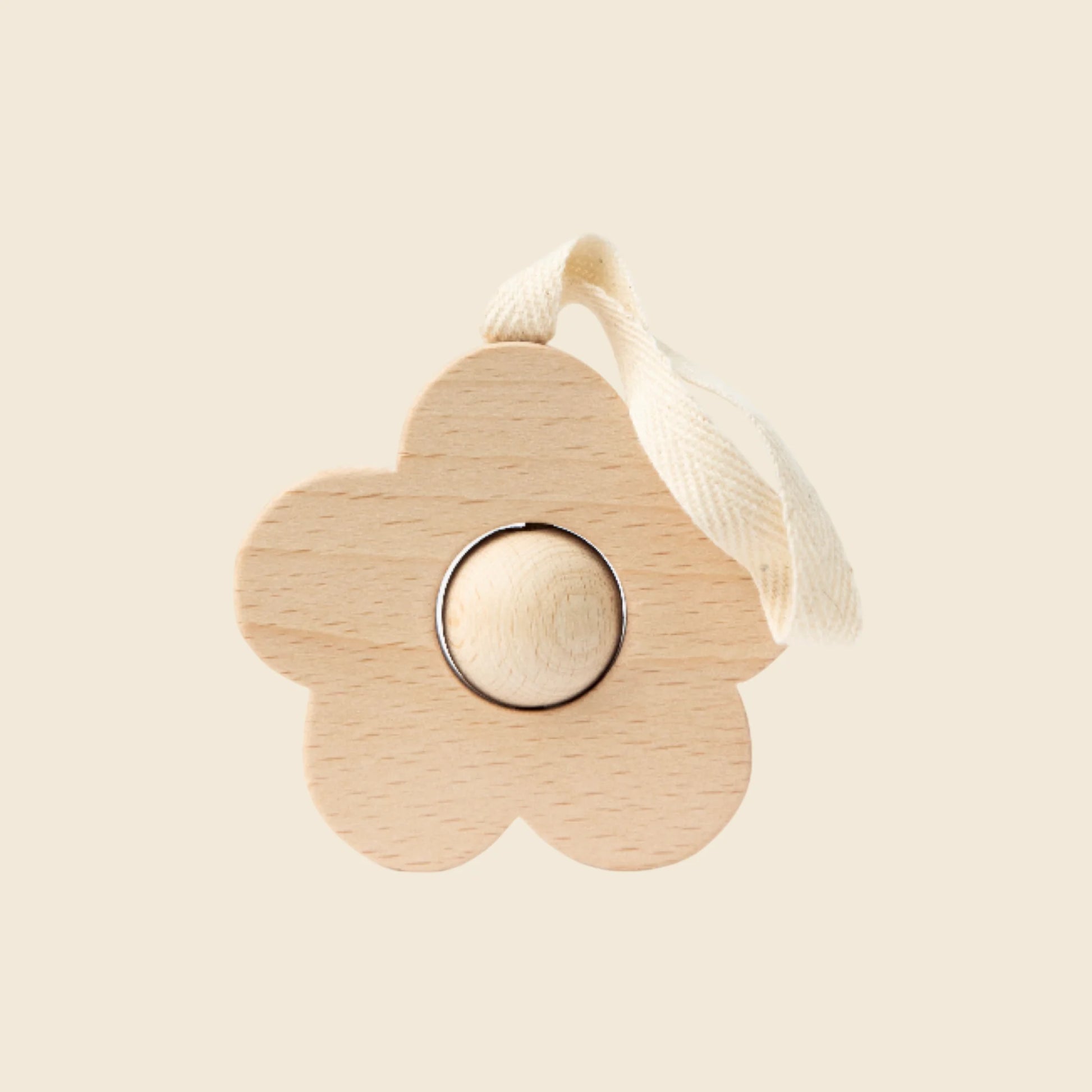 A flower to hang everywhere, and to take everywhere. Easy to catch and handle, with a mobile ball in the center stimulating fine motor skills. A wooden flower that can be put in the mouth to relieve the gums. A raw wooden toy, without varnish or products, to be given as a gift from birth. An object that will stand the test of time, whether in small hands or in decoration. To play with poetry and simplicity, and to gently awaken to the world.