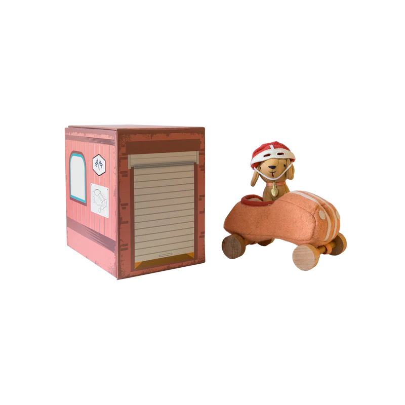 Unleash the excitement with our Holdie World™ Dog-Gos. Sporting a speedy helmet and googles, Racer Girl brings a whole new meaning to the phrase "hot dog" behind the wheel. When the day is done, Dog-Go Racer Girl loves to park in her garage box, ready to play again tomorrow.