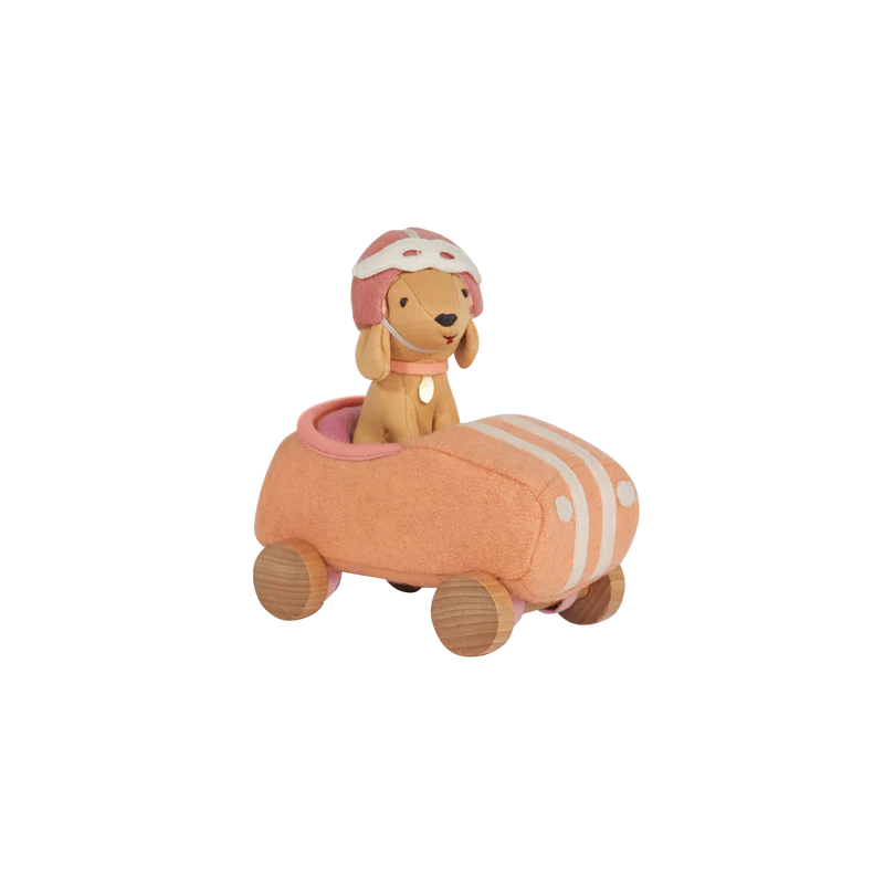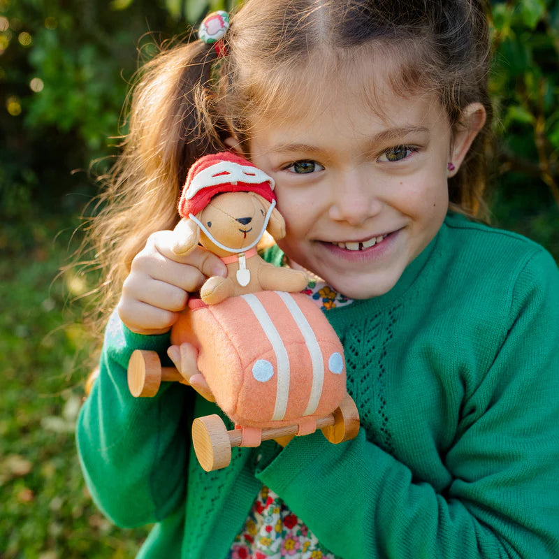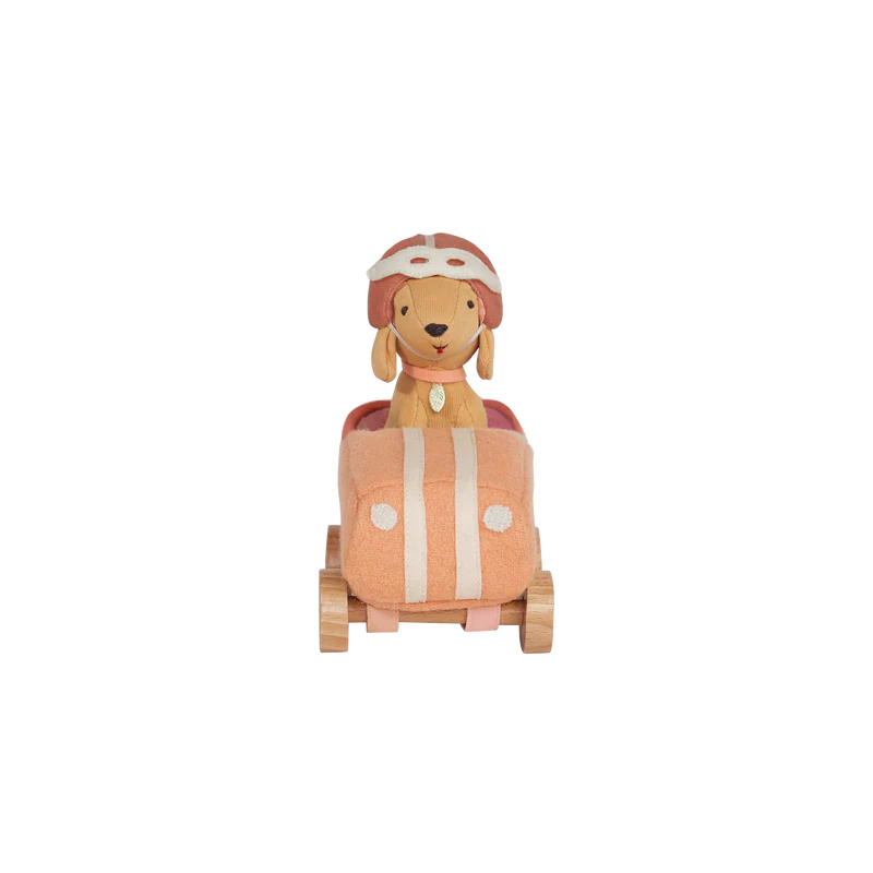 - Made from a wool blend with embroidered features, nestled in a classic car with wooden wheels.