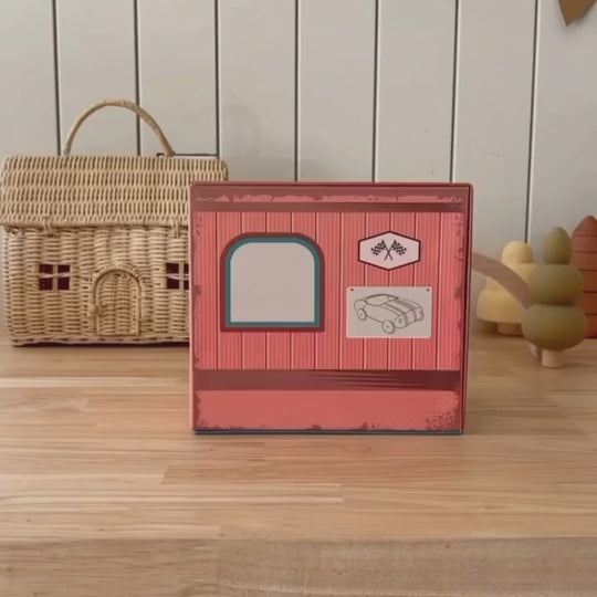 - Garage-themed box is designed to unfold and use as a pretend play prop