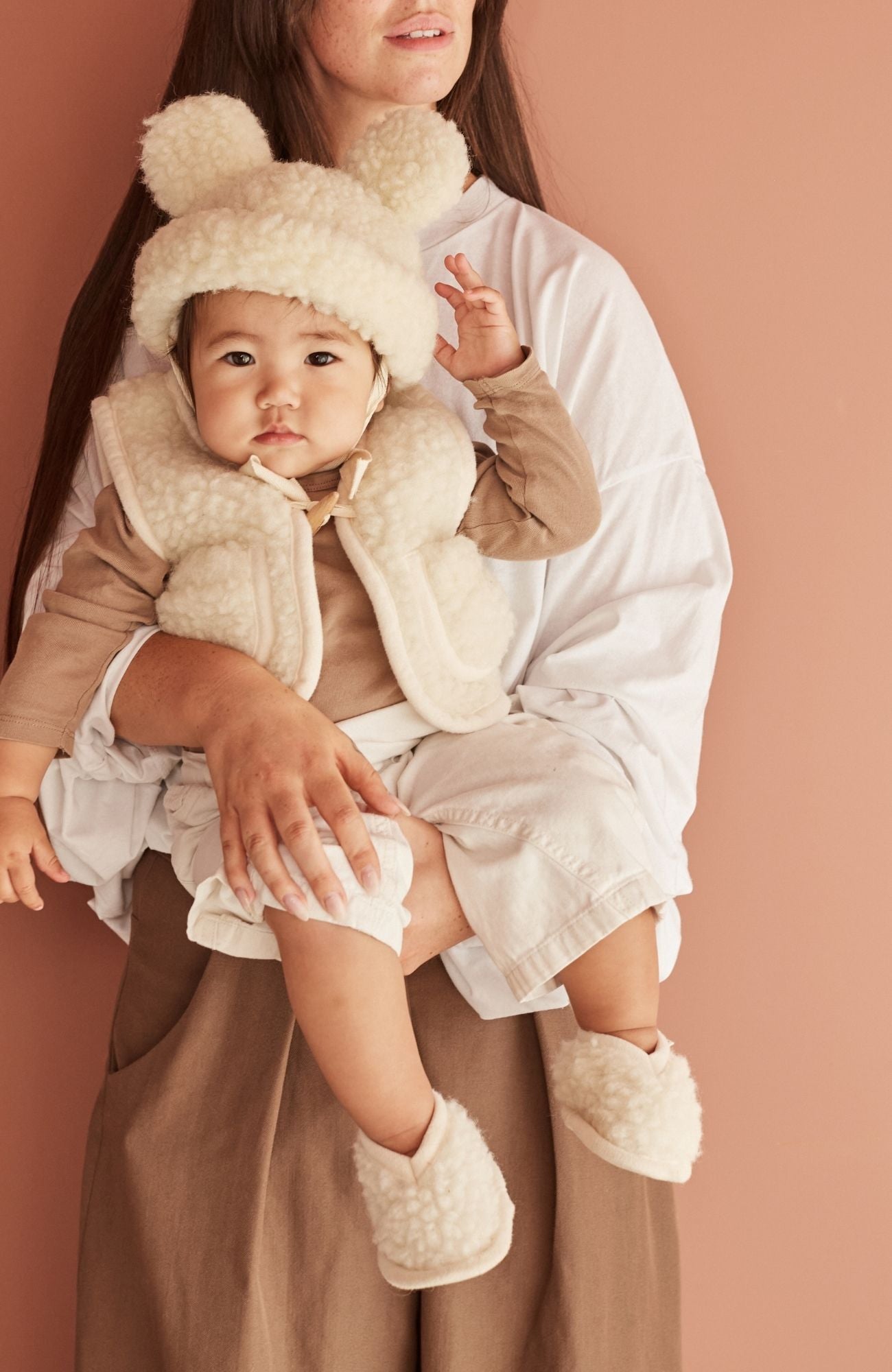 Cocooned & cosy... first steps never felt so good. Our merino, leather soled booties in MILK will have Binibabes walking on air.