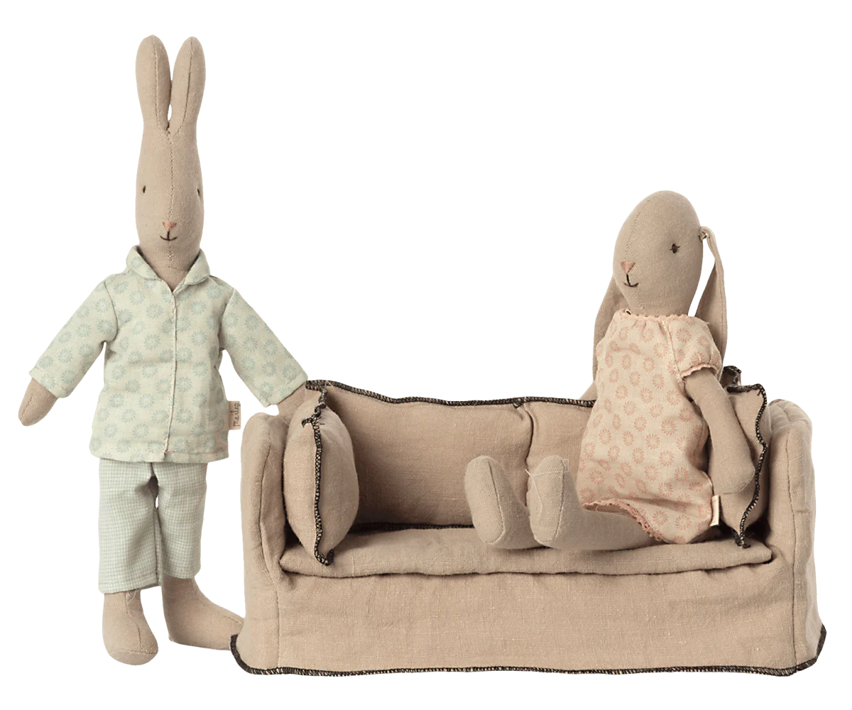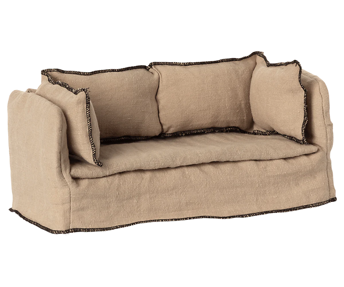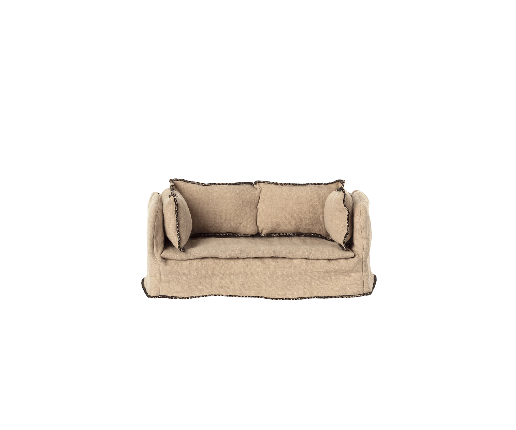 Take a break on this lovely couch. It has a wooden center and a soft cover made in lovely linen quality. Match it up with the coffee table, and it fits perfectly into the Maileg dollhouse.