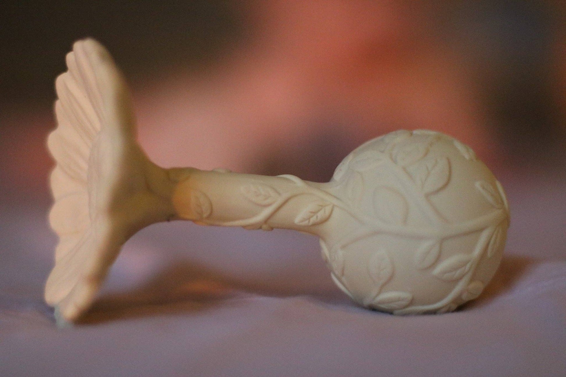 Textured leaf pattern on bottom, stem and textured flowerhead, silk like surface touch, bell inside. No holes or valves.