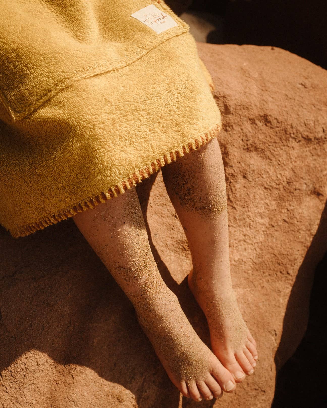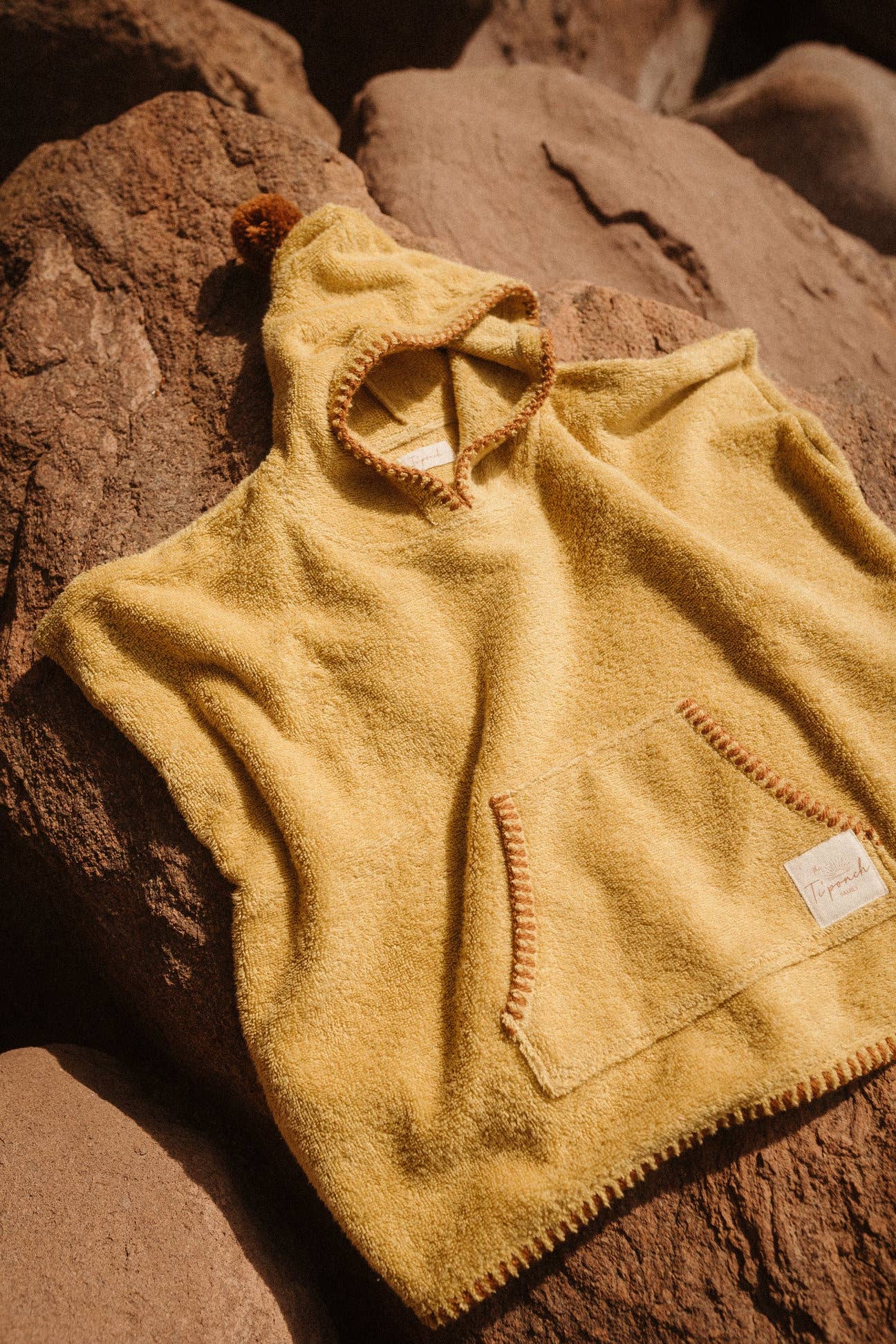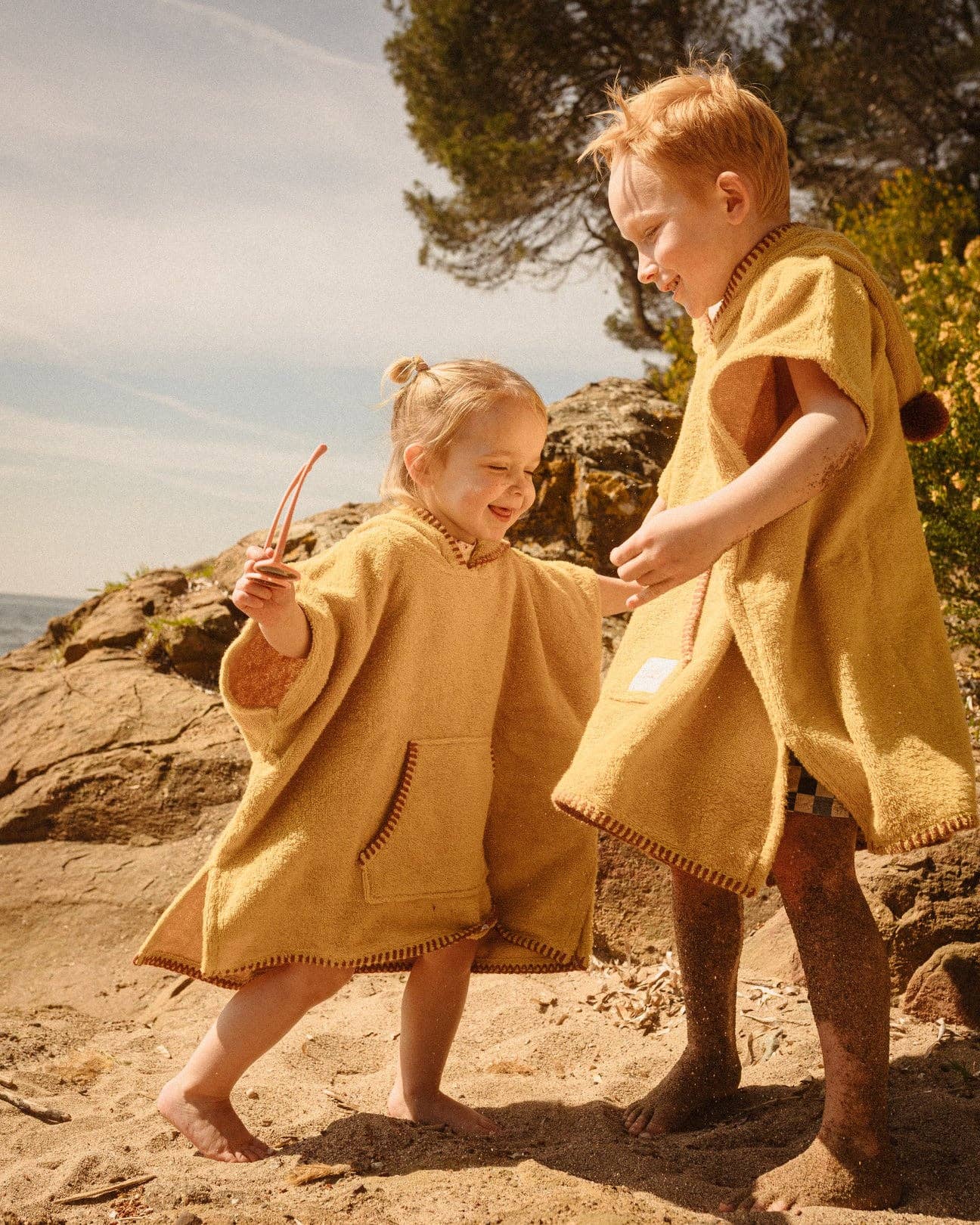 Child's poncho in soft terry cloth, embroidered details and pompom hood ☀️ Summer: comfortable for getting out of the water, having a snack, protecting from the sun, building beautiful sandcastles, and even changing easily in complete discretion. 💦 After the bath: slips on quickly to dry in a flash. Nothing better to wrap up and stay warm quickly all year round! ✌🏻 Closed on the sides for comfort, everywhere and all the time.