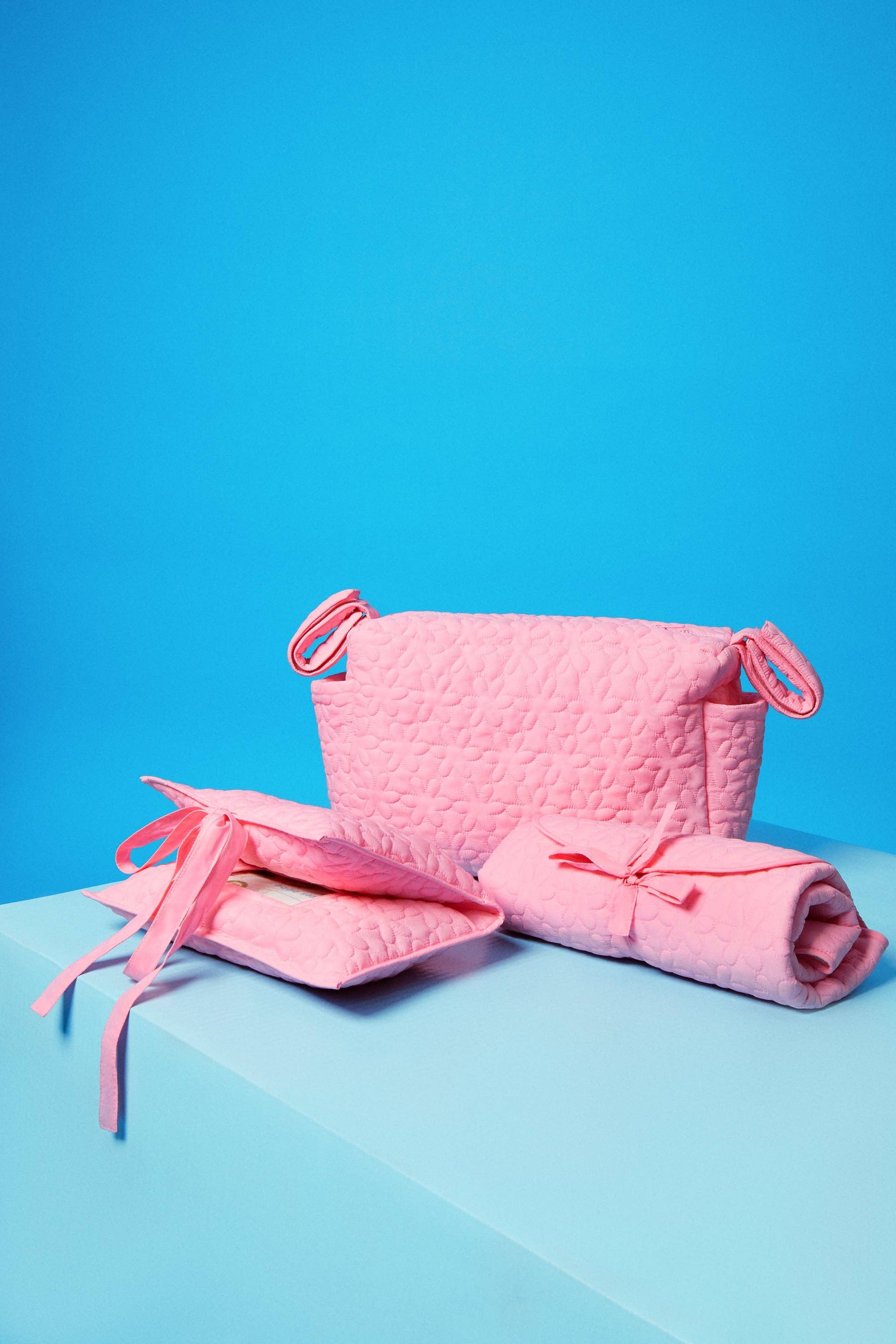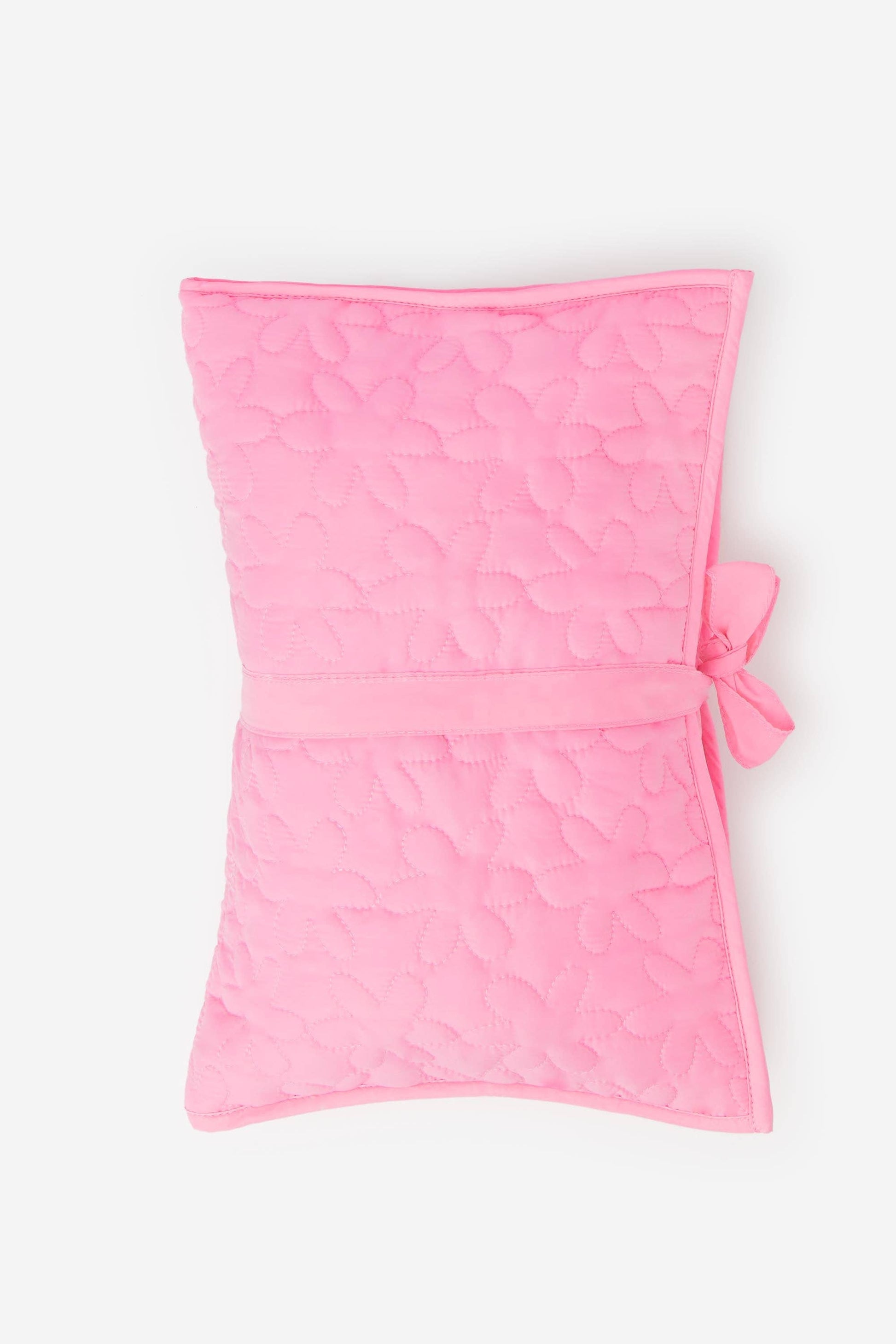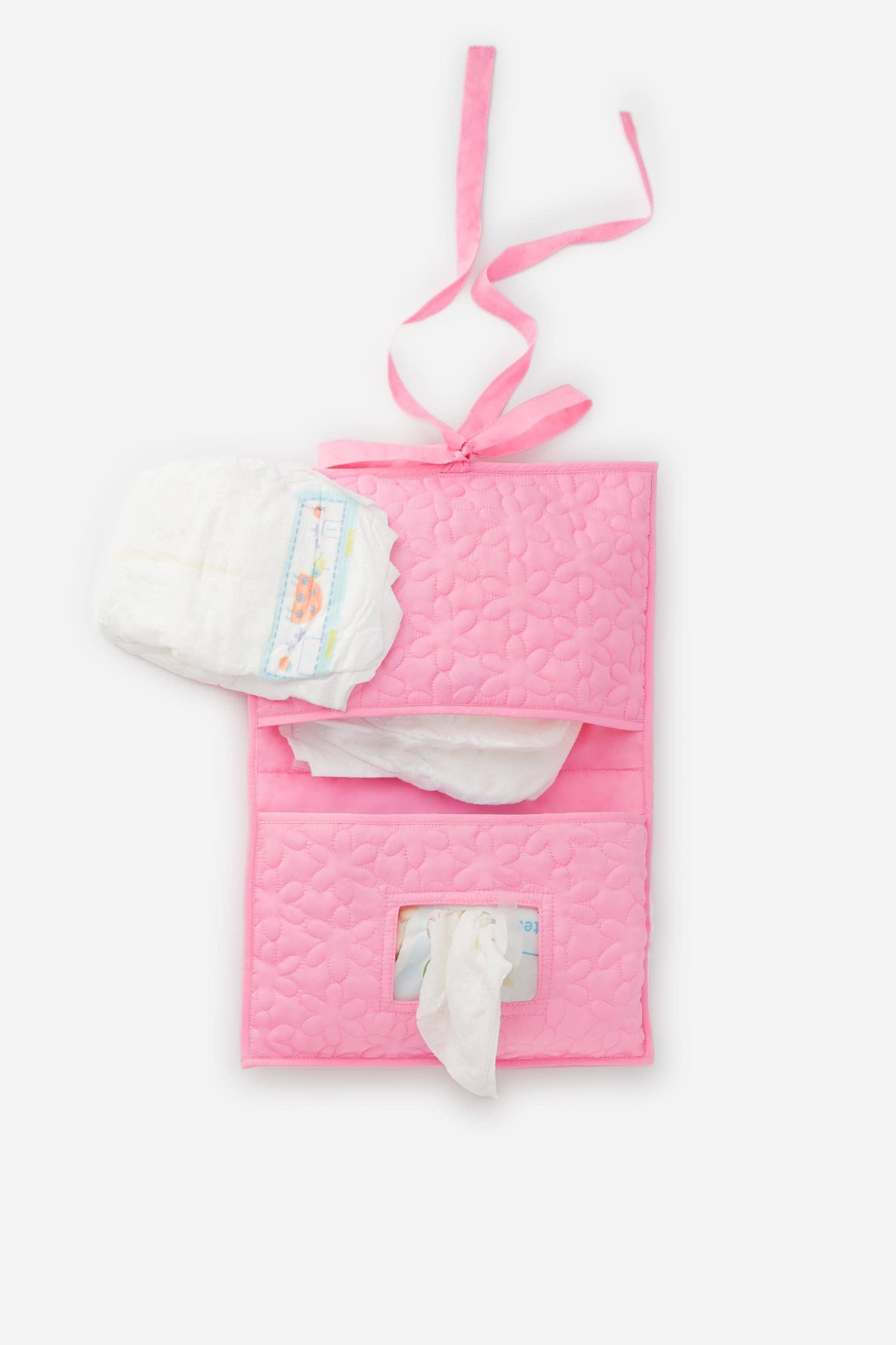 Discover our quilted pink nylon pouch for diapers and wipes with our iconic floral pattern. Made from a soft and lightweight technical material.