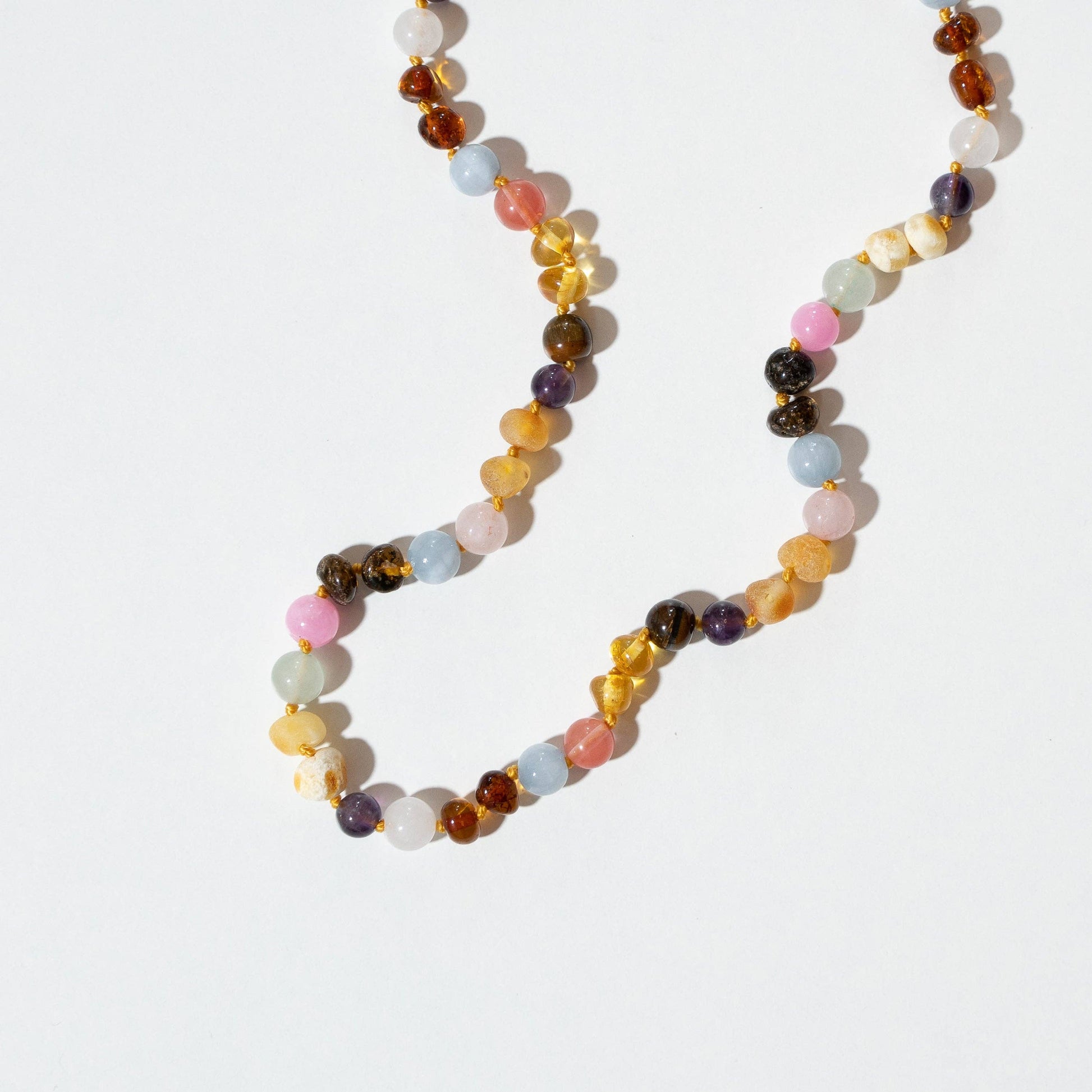 Our popular Rainbow necklace is a mix of Amber and Gemstones. You will find Amethyst, Rose Quartz, Aventurine, Jade, Cherry Quartz, Moonstone & labradorite. Safety clasp