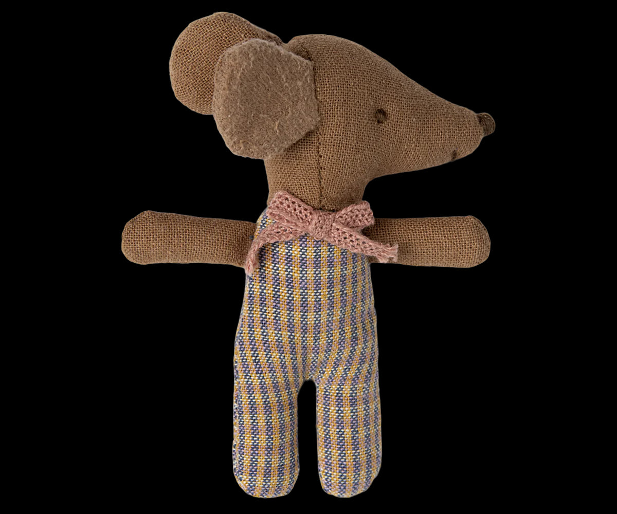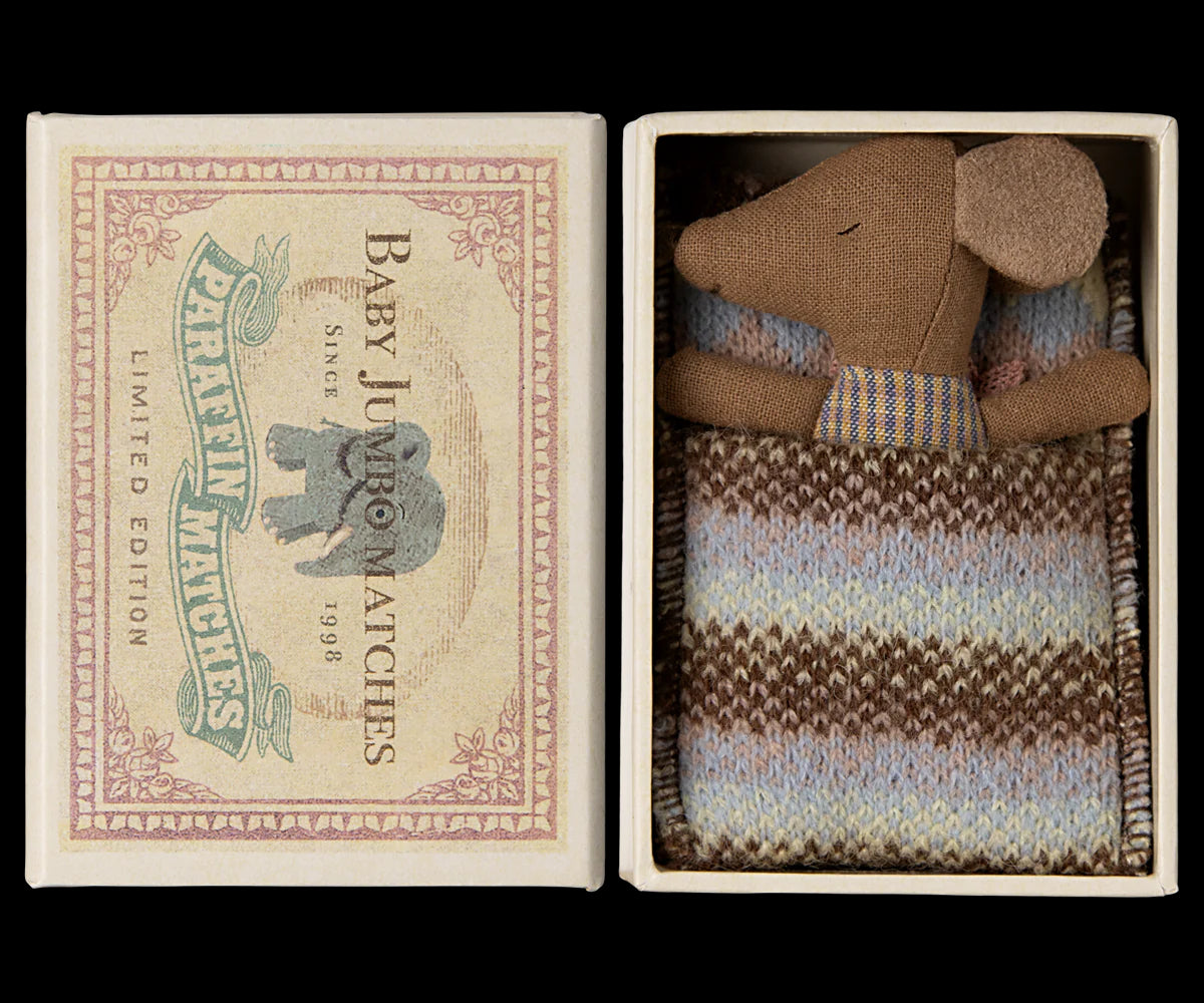 A classic Maileg item. This mouse is ready for hours of play and sleeps tight in the little matchbox. The clothes and bedlinen are made of soft fabrics with unique prints in beautiful colors.