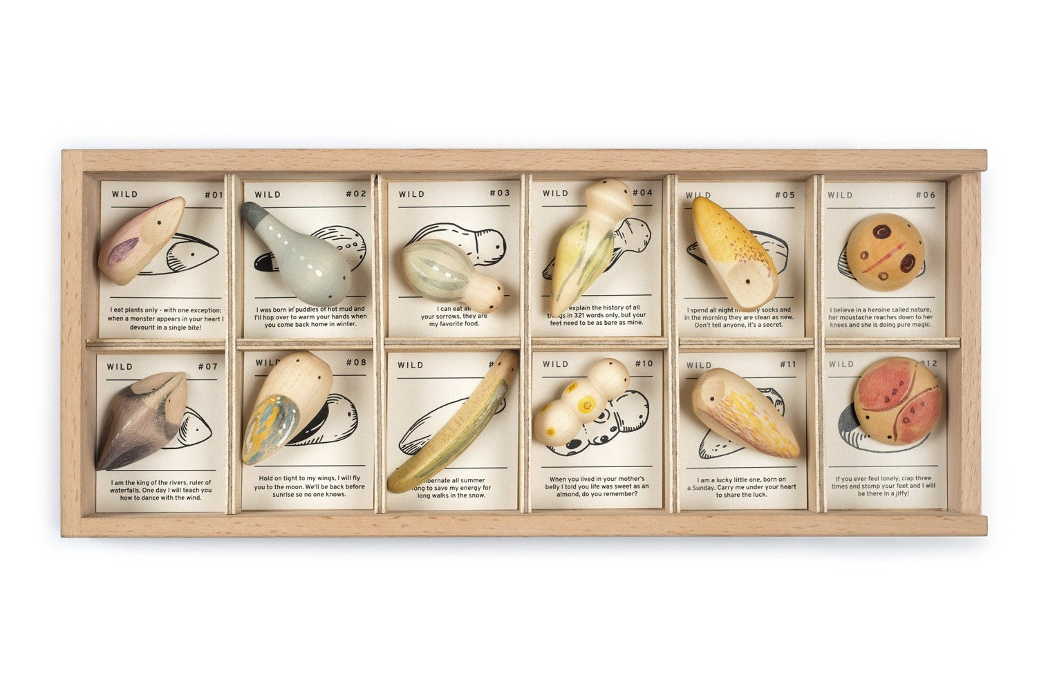 Wild is a collection of 12 creatures from the fauna realm. On the edge between fantasy and reality, each has their own superpower and story written on their card as an invitation to play. The sorting tray is included for storage and collecting, but can become a perfect complement to any open-ended play activity.