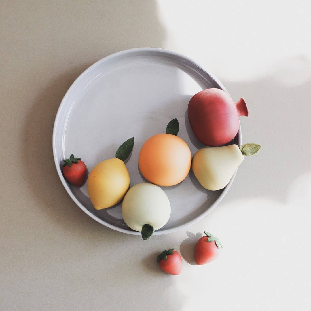 The set includes 6 kinds of fruit: pomegranat, pear, apple, orange, lemon and 3 strawberries.