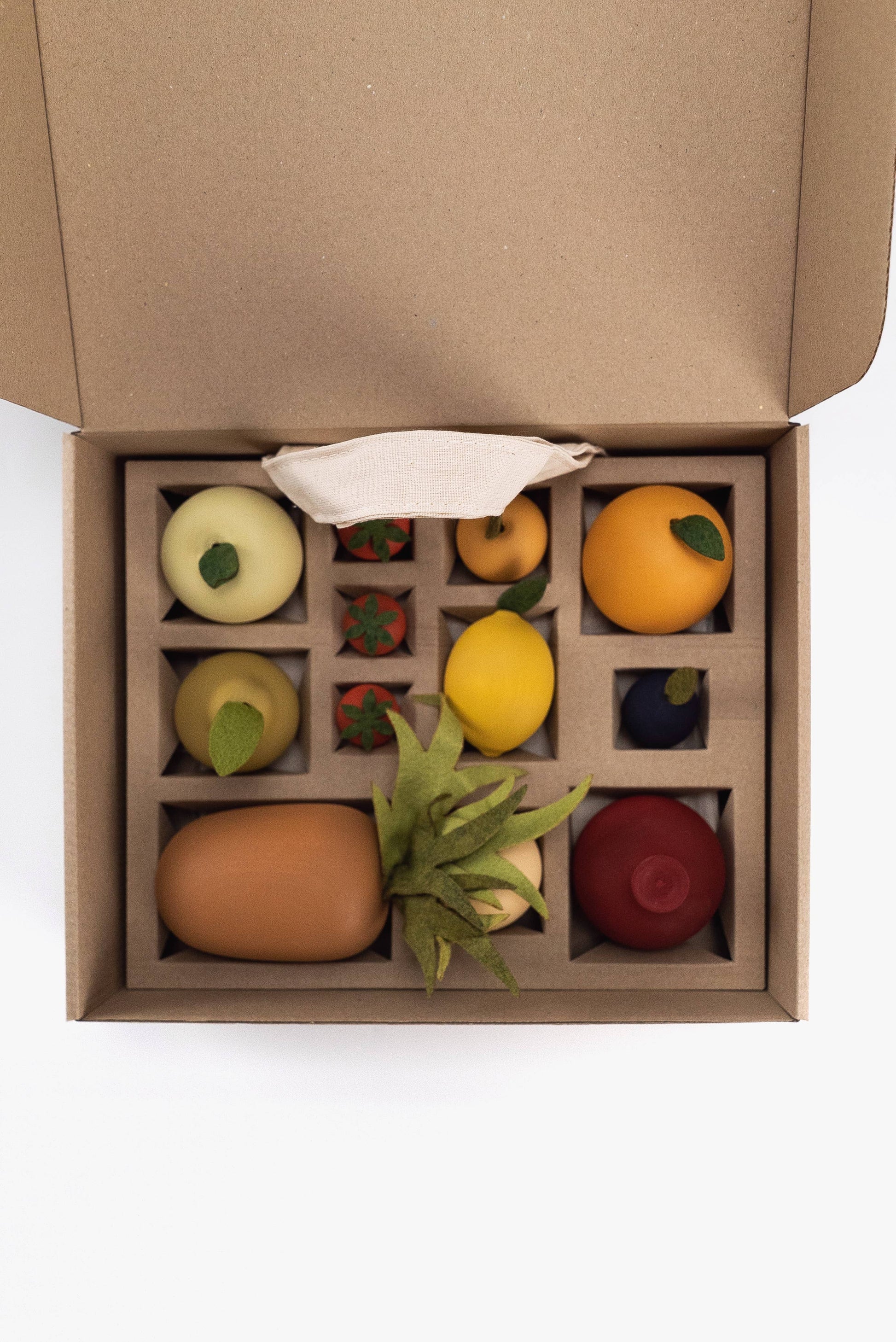The set includes 10 kinds of fruit: pineapple, pomegranat, pear, apple, peach, apricot, plum, orange, lemon and 3 strawberries.